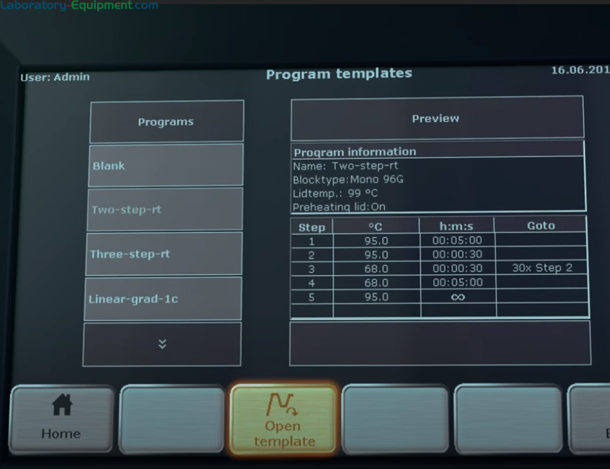 Protocol Wizard software features: pre-installed program templates for specific polymerases, 350 programs at 6 steps in up to 90 user directories, multi-step programming enables user to edit parameters within a single screen, PCR control app (enables connection to a smart phone or tablet), quick-start list of programs, extended self-test checks all relevant features, data management (direct spreadsheet and graphical programming), language( English, German, Chinese)
