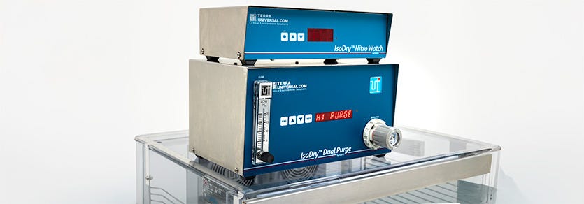 Desiccators are a safe means of storage for highly-sensitive samples or materials. A continuous purge of nitrogen or other process gas creates the positive pressure environment that’s conducive to a contamination- and humidity-free desiccator. But, what if a purging system allowed your desiccator to do more than just store parts? What if it also automatically reduced nitrogen costs and prevented overpressure? Terra’s Dual Purge system does exactly that—and when it’s paired with the NitroWatch humidity control system, the relative humidity percent set-point is automatically monitored and maintained. Keep reading to find out how this dynamic duo has changed the way we use desiccators.