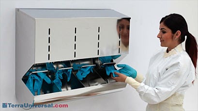 Glove Dispensers Terra Universal manufactures application-specific dispensers for clean room gloves, hats, booties and other supplies. These space-efficient clean-room compatible units eliminate clutter and reinforce garbing protocol by putting garb and apparel exactly were personal require them.