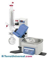 Manual rotovaps with a one-handed lifting mechanism with or without distillation glassware; select models include shatterproof glassware and dry ice condenser