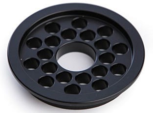 Aluminum Tube Fixation for SpeedMill PLUS Sample Holders locks to secure Lysis Tubes from tube displacement during homogenization process; optimized for usage of innuSPEED Lysis Tube Q and a permissible pre-chilling temperature of -80°C