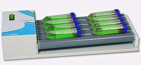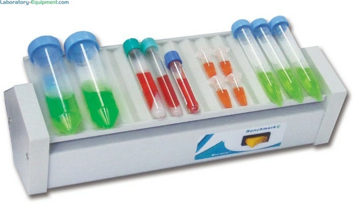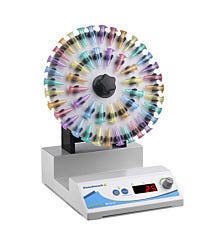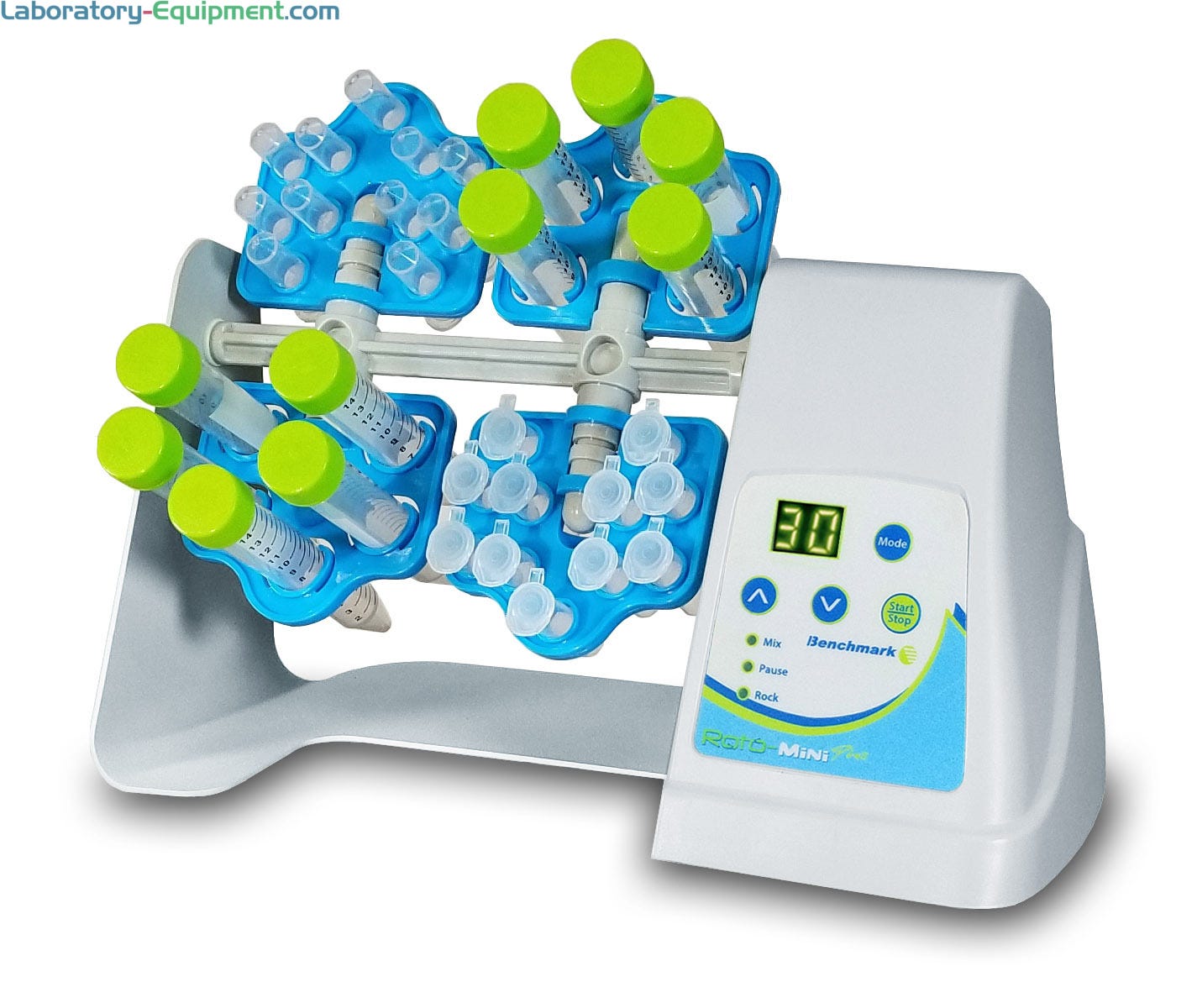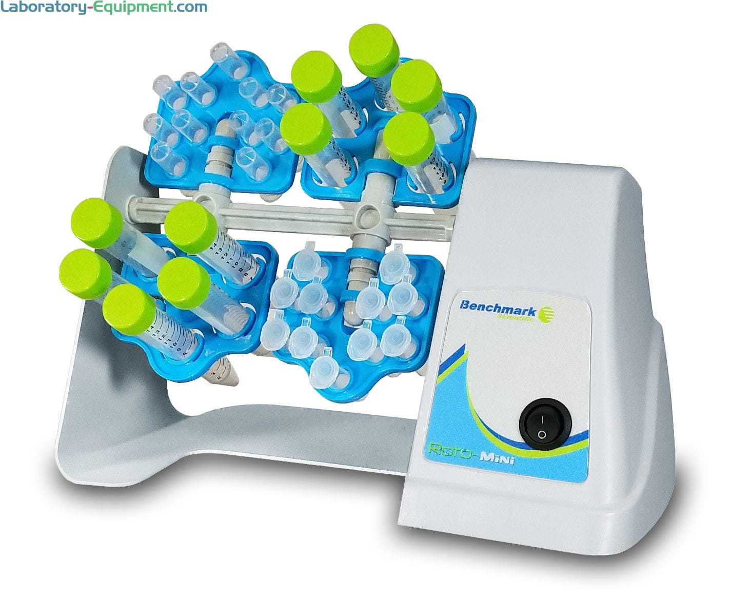 Roto-Mini Rotators by Benchmark Scientific with a 24 rpm fixed speed features mix, pause and rock functions; 115V and 230V models include 4 tube holders