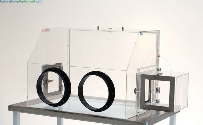 Acrylic laboratory glove box includes two glove ports (shown with optional air lock and relief/bleed valves) | 1689-00H displayedAcrylic Laboratory Glove Box for Basic ResearchAcrylic laboratory glove box includes two 10" (254 mm)-diameter glove ports and dual-side stainless steel-reinforced access doors (shown with optional air lock and relief/bleed valves).