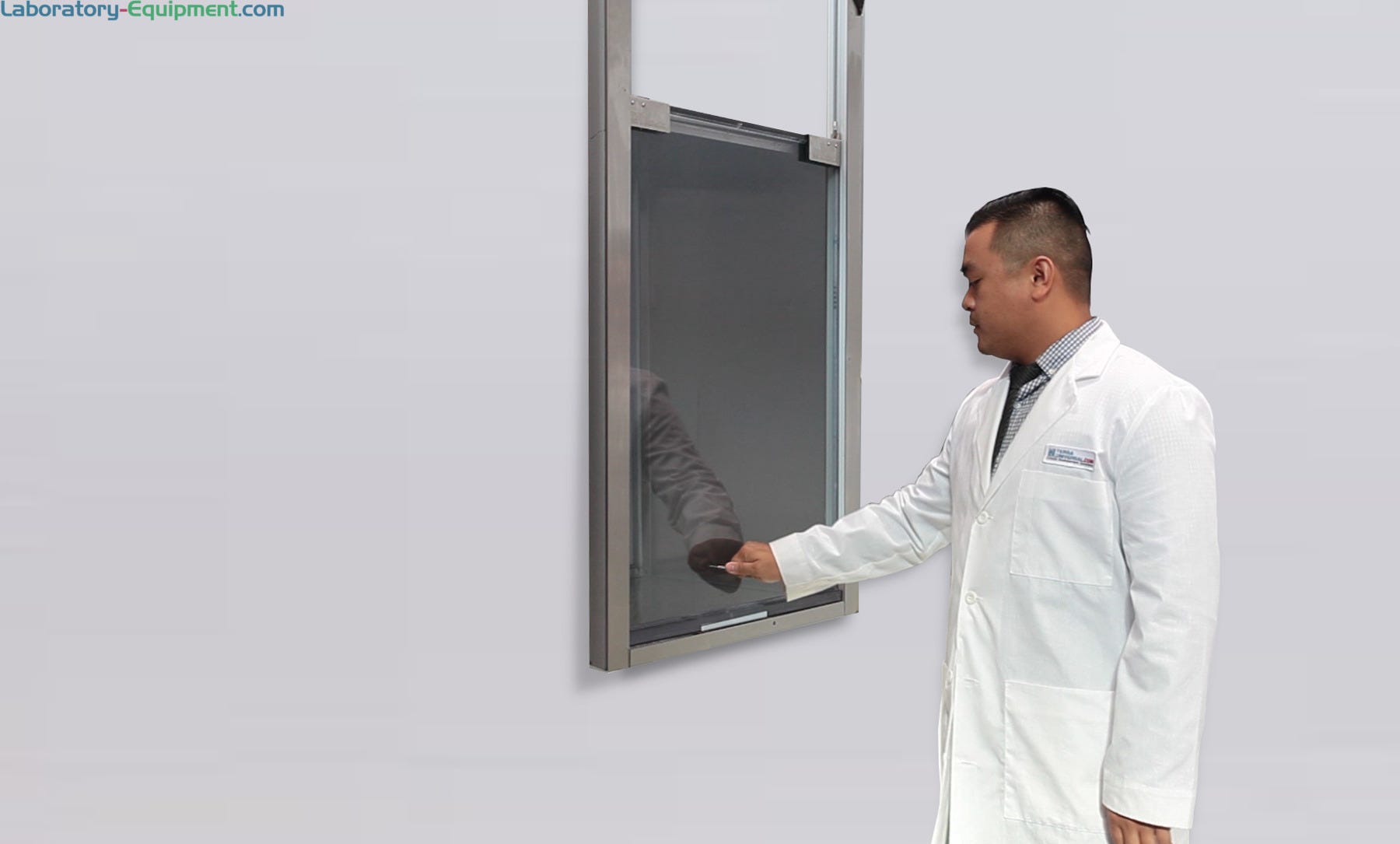Vertical sliding convenience window for hospital lab; counterweighted door, built-in shelf; ideal for facilities with high ceilings and limited wall space | 1702-87 displayedVertical Sliding Pass-through Convenience Window for Hospital LabTerra’s vertical sliding passthrough convenience window is perfect for hospital labs with high ceilings and limited wall space. The counterweighted door holds open so it won’t accidentally fall while being held open. The built-in shelf holds parts and materials waiting to be transferred.