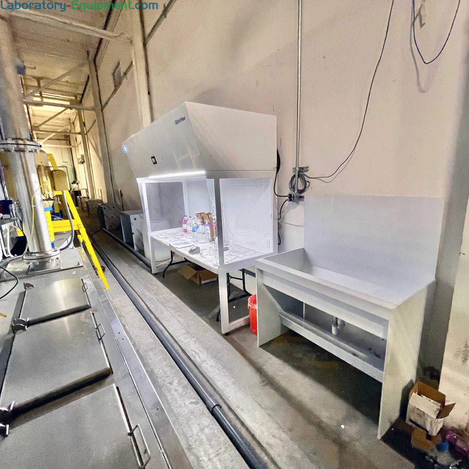 Custom polypropylene industrial utility sink to rinse corrosive chemicals, 48"W x 24"D, installed next to vertical laminar flow hood station | 7019-48 displayedIndustrial Polypropylene Sink Basin to Rinse Corrosive ChemicalsIndustrial polypropylene utility sinks are perfect for processes involving corrosive chemicals. This custom sink basin is installed adjacent to a vertical laminar flow hood to streamline cleaning.