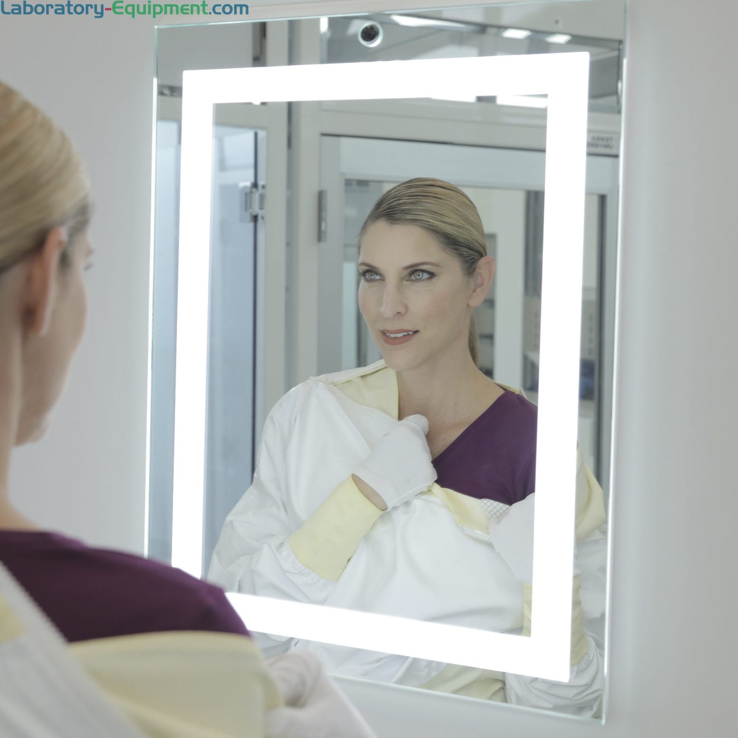 Frameless wall mounted cleanroom mirror with motion sensor LED lighting | 5252-74 displayedISO-Rated Frameless Cleanroom Mirror with LED LightingFrameless Clean Room Mirror with LED Backlighting includes adjustable motion sensor for optimal viewing in dimly lit locations