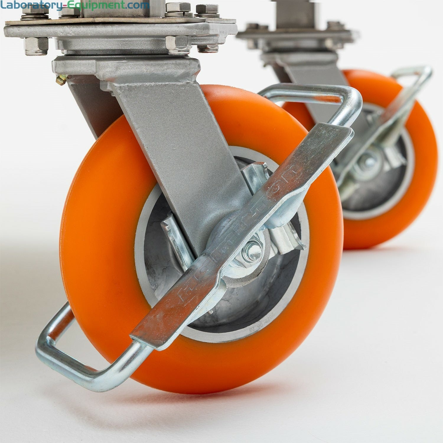 - Stainless steel casters with non-marring, chemical-resistant white Polyolefin wheels, ideal for applications with strict sterilization protocols.