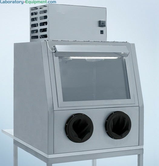 Stainless Steel Insulated Glovebox Shown with optional temperature control system and stand. | 1696-06A displayedInsulated Stainless Steel Glovebox with Partial Tilt up WindowDouble-walled, insulated chamber boosts thermal efficiency to create stable process temperatures. Includes fluorescent illuminator, RB Valve, Side door included with optional air lock