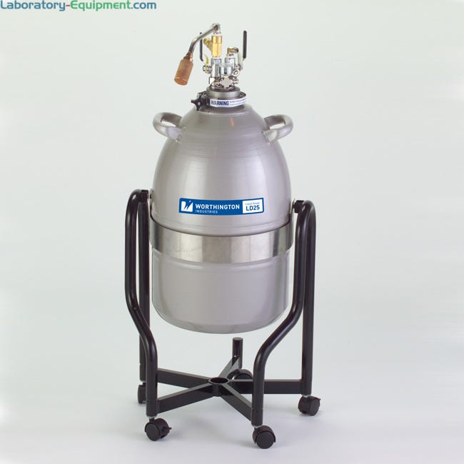 The stand supports the weight of the dewar for safe and easy dispensing of liquid nitrogen (includes casters for mobility). The liquid withdrawal device dispenses liquid nitrogen at 8L/min (shown with optional phase separator on tip).